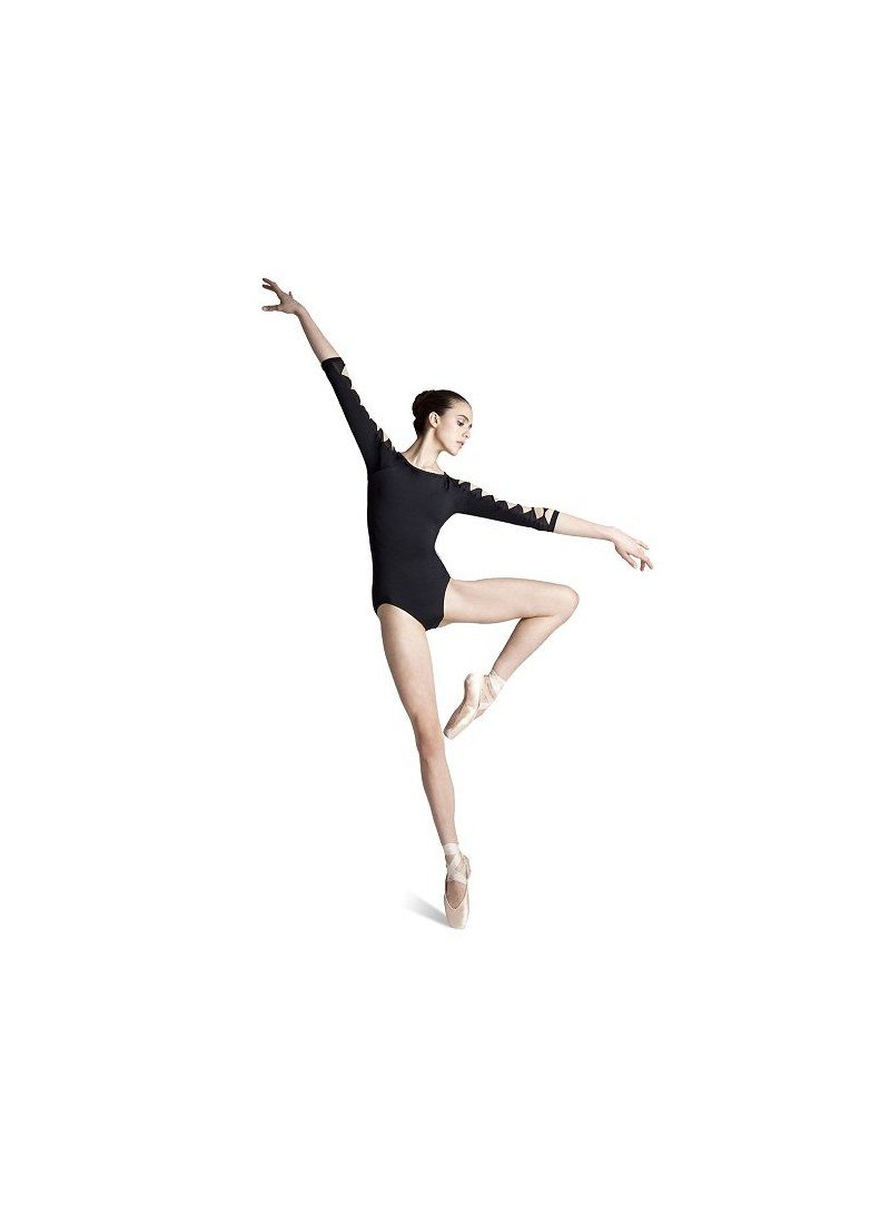 A 3/4 sleeve leotard features an innovative harlequin cut out pattern on the arm with spacious open back for extra styling.