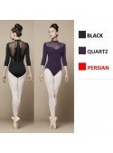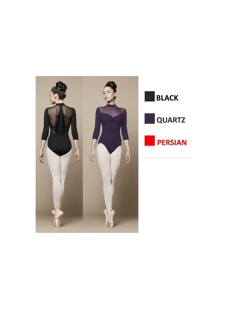 Move with ultimate comfort and confidence in Faye, a leotard designed to perfectly fit and flatter the dancer's form. On the back, a layer of sheer mesh is embellished with an intricate floral motif, with a functional central zipper fastening. The front of the piece keeps it simple yet elegant with a matching mesh panel, high neckline and ¾ length sleeves.