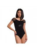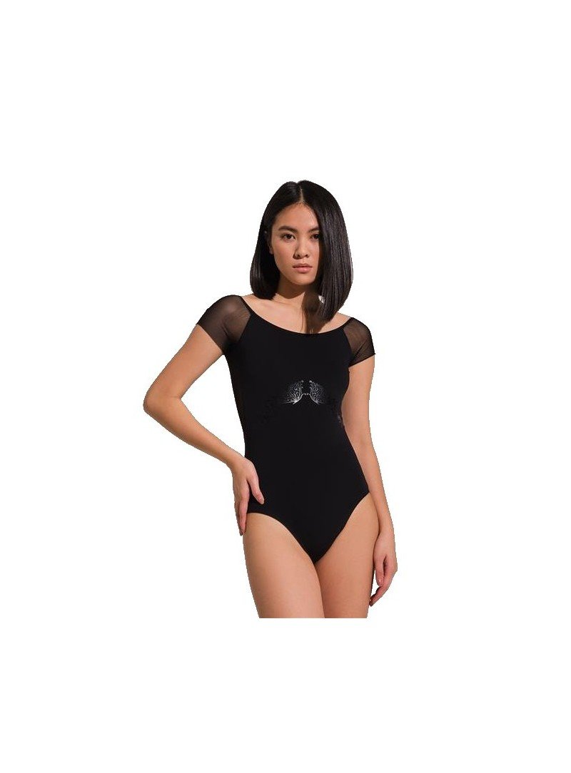 Body con maniche ad aletta con dettagli stampati a farfalla in rilievo sotto la linea del busto con scollo rotondo. Schiena bassa aperta. Scollo tondo, maniche in rete grezza.